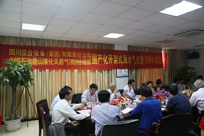 10月6日,中國機(jī)械工業(yè)聯(lián)合會(huì)在浙江省德清縣四川空分集團(tuán)浙江大川公司組織召開了國產(chǎn)化開架式氣化器鑒定會(huì)。國家能源局科技裝備司副司長黃鸝,中國機(jī)械工業(yè)聯(lián)合會(huì)總工程師隋永濱,中石油唐山LNG項(xiàng)目部王德峰總經(jīng)理助理以及中國空分公司原總工程師江楚標(biāo),清華大學(xué)、華中科技大學(xué)、中國海洋石油公司、中國石化公司、中國寰球公司、北京礦冶研究院的專家,四川空分(集團(tuán))公司領(lǐng)導(dǎo)單金銘、楊美原、易希朗、黃科、謝波等參加鑒定會(huì)。