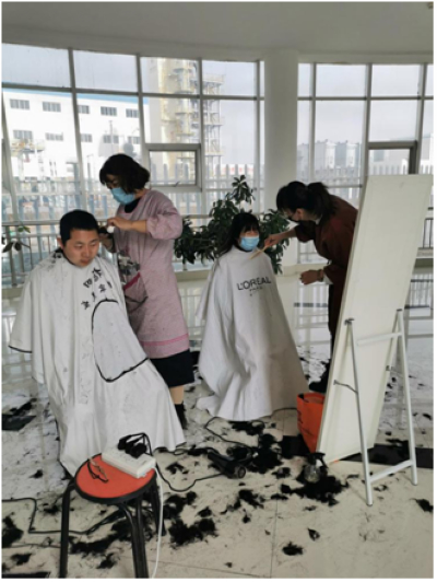 2月20日,公司通知員工到指定地點(diǎn)剪發(fā),提前對(duì)剪發(fā)區(qū)域和剪發(fā)用具進(jìn)行酒精消毒,對(duì)剪發(fā)的員工做好體溫測(cè)量工作。兩個(gè)板凳、一面鏡子,我們的剪發(fā)工作開始了。
