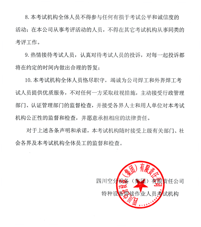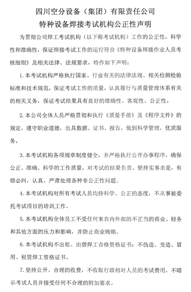 四川空分設(shè)備(集團)有限責任公司——特種設(shè)備焊接考試機構(gòu)公正性聲明