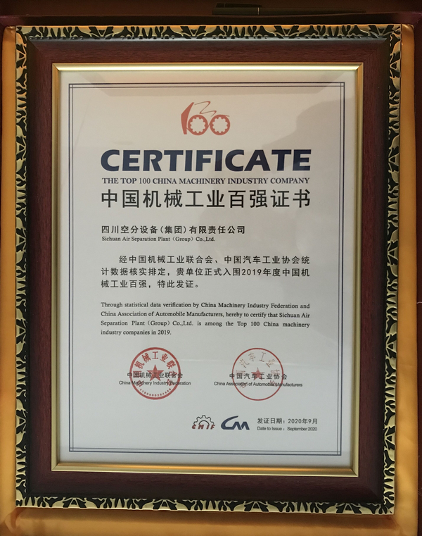 近日,我公司被評(píng)為2019年中國機(jī)械工業(yè)百強(qiáng)企業(yè),位列第70名。這項(xiàng)榮譽(yù)代表著客戶、行業(yè)和社會(huì)對(duì)四川空分集團(tuán)的肯定和認(rèn)可。
