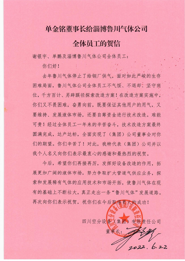 去年魯川氣體停止了給鋼廠供氣,面對(duì)如此嚴(yán)峻的生存困難局面,魯川氣體公司全體員工不氣餒、不退卻、堅(jiān)守崗位,千方百計(jì)、另辟蹊徑探索改造方案!在改造方案實(shí)施中,你們又不畏困難,奮勇向前,既要保證其他用戶的用氣,又要維持、發(fā)展液體市場(chǎng),還要自籌資金進(jìn)行技術(shù)改造。難能可貴!經(jīng)過全體員工一年來的辛苦奮斗,技術(shù)改造方案最終圓滿完成,達(dá)產(chǎn)達(dá)標(biāo),全面實(shí)現(xiàn)了(集團(tuán))公司董事會(huì)對(duì)你們的期望。你們辛苦了!對(duì)此,我特代表(集團(tuán))公司并以我個(gè)人名義向你們表示最衷心的感謝和最熱烈的祝賀。