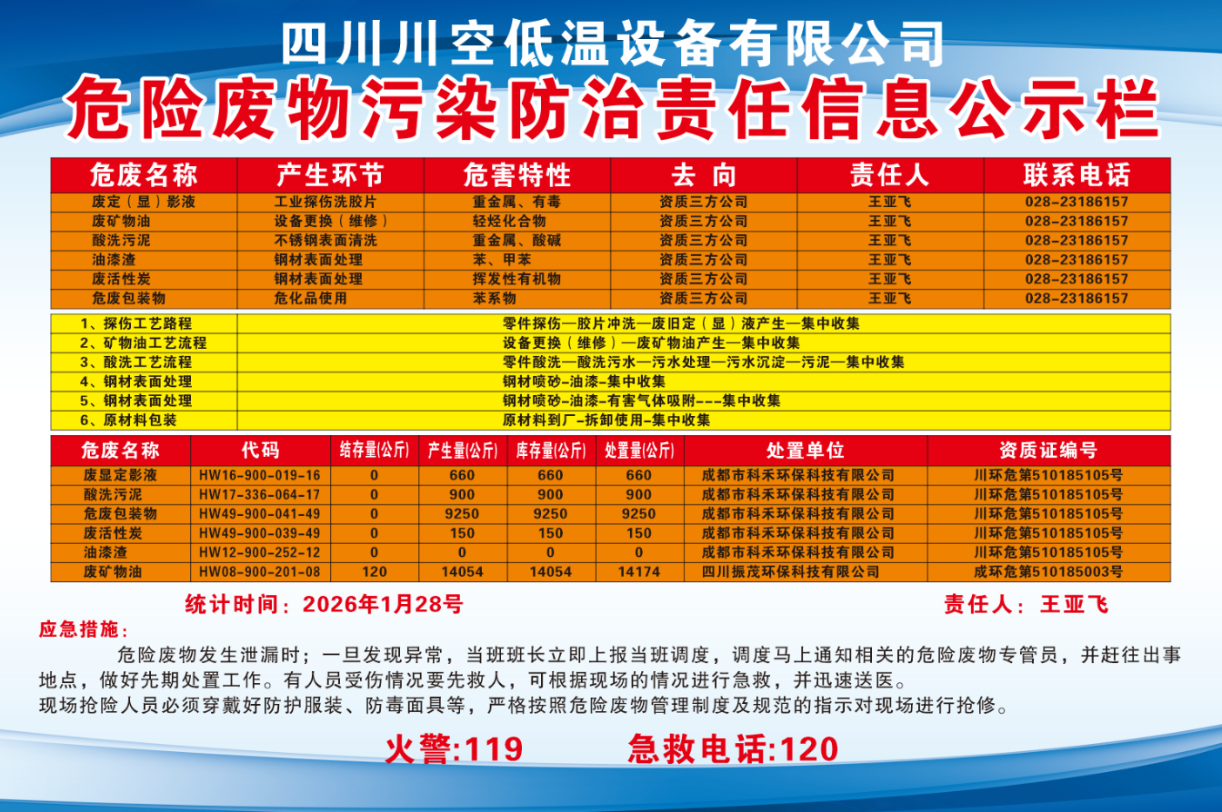 四川川空低溫設(shè)備有限公司危險(xiǎn)廢物污染防治責(zé)任信息公示欄