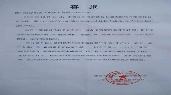 喜訊:由四川空分設(shè)計(jì)制造的志丹二期20萬噸/年LNG液化冷箱一次性投產(chǎn)成功