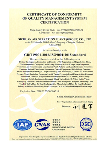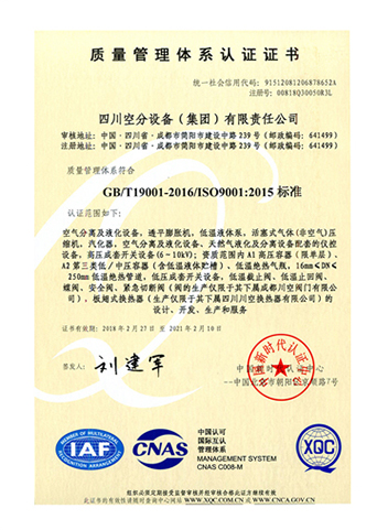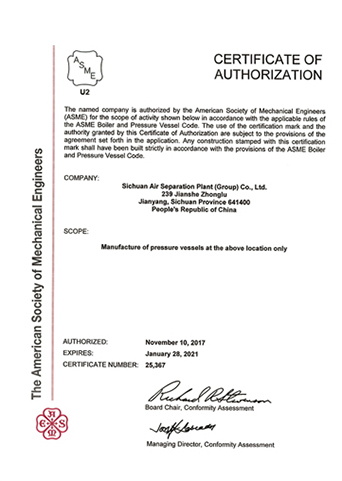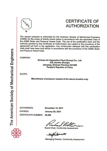 公司在推行全面質(zhì)量管理的基礎(chǔ)上,通過各種專業(yè)認(rèn)證,進(jìn)一步提高了公司質(zhì)量管理水平和質(zhì)量保證能力。公司早在1987年就取得三類(A級)壓力容器設(shè)計、制造資格,順利通過了國家主管部門組織的歷次換證評審,目前公司已具有A1、A2、C2級壓力容器設(shè)計資格,GC1級壓力管道設(shè)計資格,A2、B3、C2級壓力容器制造資格。全面覆蓋公司所設(shè)計、制造的壓力容器、壓力管道及元件種類。公司于1990年取得美國機械工程師協(xié)會頒發(fā)的ASME授權(quán)證書及U、U2鋼印,并順利通過歷次換證檢查;公司于1996年取得中國機械工業(yè)認(rèn)證中心頒發(fā)的GB/T19001質(zhì)量管理體系認(rèn)證證書并順利通過歷次換證審核;2003年,公司的低溫液體運輸車、半掛車首批取得國家3C強制認(rèn)證。公司出口的成套空分設(shè)備和天然氣液化設(shè)備通過了歐盟CE認(rèn)證。